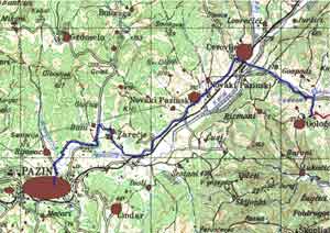 Izlazimo na asfalt, skrećemo desno, te se njime spuštamo do sela Paz. Prođemo kroz njega, te iza crkvice  Svetog Vida (i groblja) skrenemo lijevo na makadam. Kreće spust kroz šumicu (vozači pozor!!!), ponovno probijamo na asfalt, na kojem skrećemo lijevo, te se i dalje spustamo prolazeći kroz selo Rakanati, livade, sve do potoka. Prelazimo ga, te nakon cca. 500 m ponovno smo na asfaltu (i ostajemo do kraja dionice).