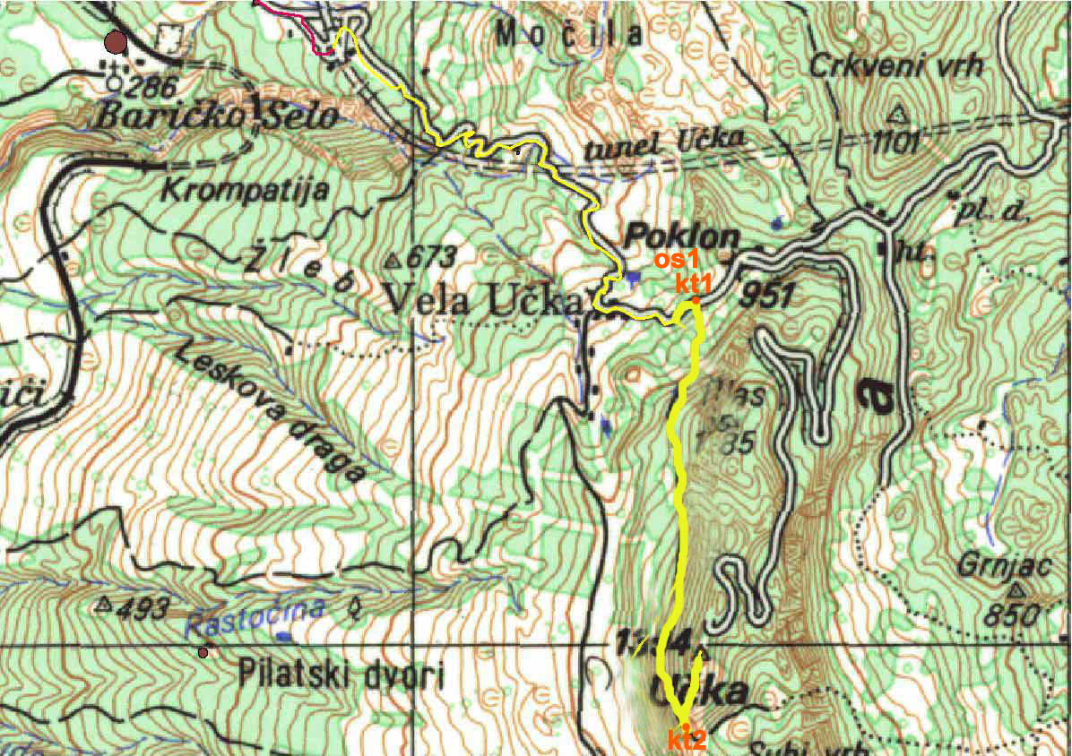 Krenemo lijevo za Kurevčiju i Ravno Brdo, te "munjevitom" brzinom prolazimo sve hupsere (manja brdaąca) krećući se u smjeru Dolenje Vasi. Nailazimo na raskriľje (lokalne razine) gdje je postavljen znak STOP (vau!) (os1). Skrećemo lijevo, te "kročimo" pravo dalje sve dok ne niđemo na mali tunelčić (tu je zbog pruge) (kt2), prođemo kroz njega, te odprilike nakon 100 m imamo lakat skretanje u desno. Ta prečica je zahvalna za izlazak na glavnu cestu Lupoglav-Vranje (odmah kraj nadvoľnjaka iznad ipsilona). Na tom mjestu krenemo desno, spuątajući se do glavne ceste Tunel Učka-Labin. Skrenemo lijevo, te po posljednji put upregnemo "motore" kako bi "doletili" na parking Tunela Učke.